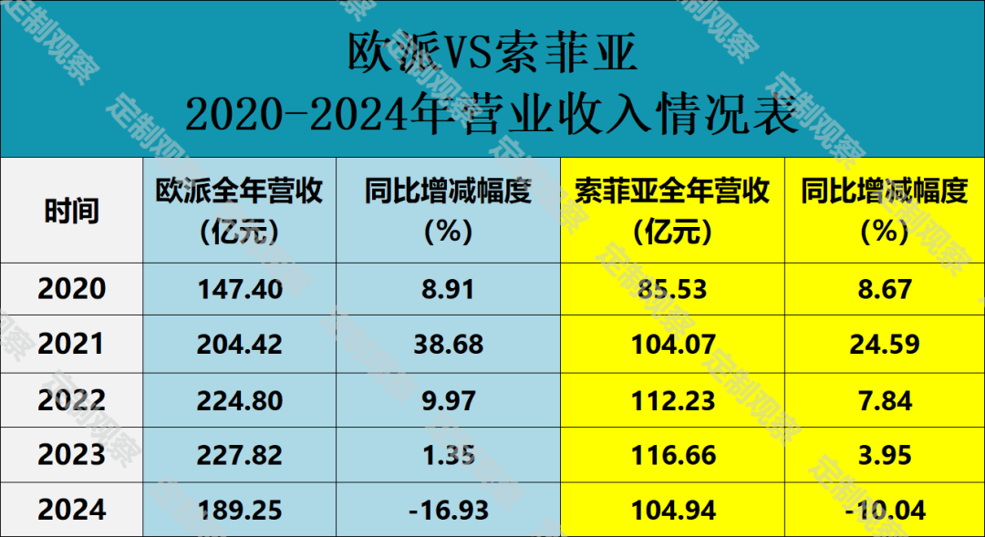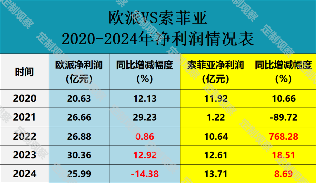 2024年上市家居企业年报收官,行业显露出新的竞争态势。从披露的相关数据来看,我们对比了欧派与索菲亚营收、净利润的情况。尽管欧派的营收和净利润有所下滑,但其整体规模依然稳居行业龙头地位。不过在创收增利方面,索菲亚持续发力,成效显著。其净利润同比增速已连续三年上涨,成功反超欧派。2024年,索菲亚成为定制家居上市企业中唯一一个实现净利润正增长的品牌。