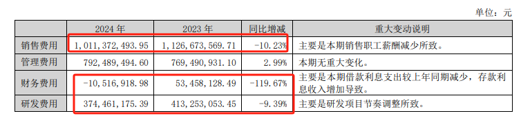 索菲亚通过优化供应链管理、提高生产效率等措施控制成本。公司在全国布局八大生产基地,建设亚洲先进的工业4.0车间,缩短产品交付周期,降低生产成本,保障前端销售,降低工厂端和经销商端运营成本。2024年,索菲亚有效管控销售费用、研发费用等,销售费用10.11亿元,同比减少约1.15亿元,主要是销售员工薪酬减少;研发费用3.74亿元,同比减少3879.19万元;财务费用由2023年的5345.81万元降至-1051.69万元,同比下降119.67%,主要因财务管理优化致利息收入增加。